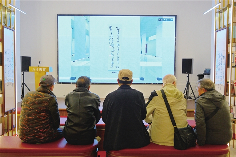 3月16日,“笔墨长存·风骨永继——林鹏先生诞辰九十八周年纪念雅集”在太原新华南宫书店举办。图为现场,观众观看林鹏作品影像展示。 王韵菲 摄