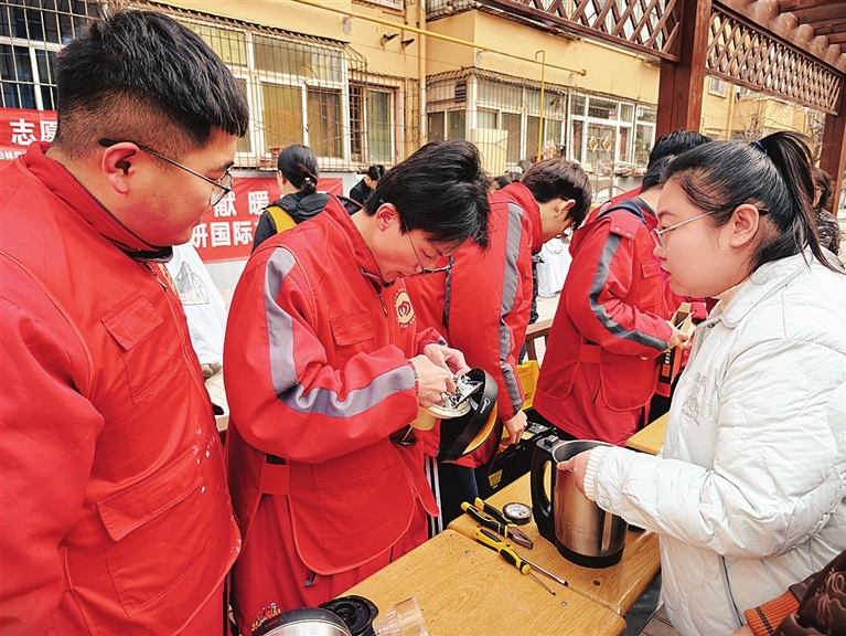 化二建三巷小区内,美容美发、工业机器人应用与维护两个专业的学生志愿者们支起便民摊,引来不少居民。“帮忙看看,它不通电了,能修好吗?”一位老人拎着热水壶过来,有学生接过,熟练地拆开外壳,拿出万用表仔细检测,很快找到故障原因。