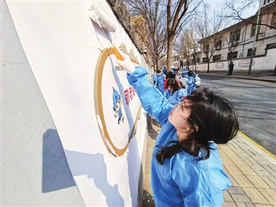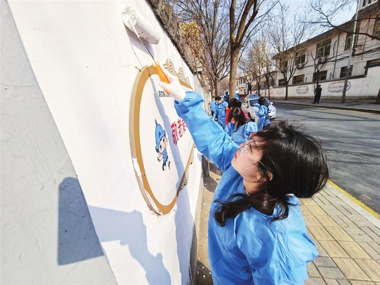“先把墙皮松动的地方铲掉,坑洼处要用腻子补平。”在街道工作人员的指导下,大家分工配合,有的清理浮尘,有的填补裂缝。虽然气温不高,但连续的体力活儿让不少人额头渗出汗水。干了一下午,小井峪北街墙面全部粉刷完毕,斑驳的老墙呈现统一的颜色,看着清爽整洁。“原先这儿墙皮掉渣,涂得乱七八糟的,现在看着利索多了。”住在附近的张师傅路过时停下脚步,和正在收工具的志愿者们聊了几句。