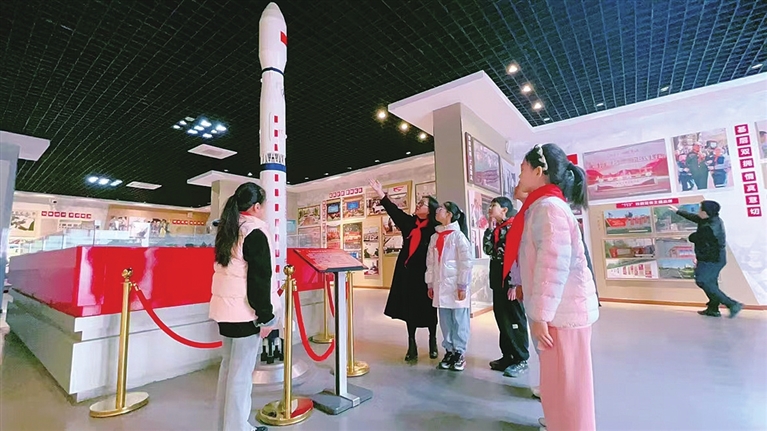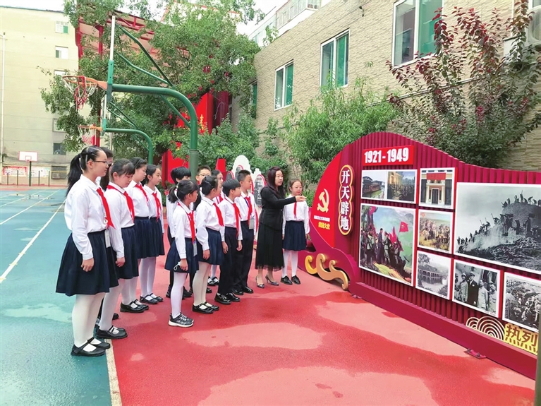 教学楼走廊的宣传栏上,中国共产党成立一百多年来的重大历史事件依次铺陈;32间教室围绕红色革命精神、党史学习教育等主题,被打造成一个“小型党史馆”,成为学生触手可及的红色课堂。课间时分,总能看见三三两两的学生驻足于此,指着一幅幅历史图片轻声交流,“快看,这里讲的是红军长征的故事。”“这幅图讲的是改革开放的历程。”红色记忆与琅琅书声交织,潜移默化中引领学生学习百年党史,传承红色基因。