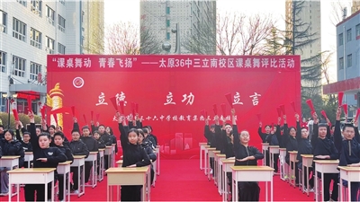 活动现场,各班学生全员参与,以课桌为舞台、双手伴随铿锵明快的音乐节拍整齐律动、激情展示。《天地龙鳞》《雪龙吟》《上春山》等曲目轮番上演,学生们在拍手、律动、节奏转换中,展现出昂扬向上的精神风貌与强烈的集体荣誉感。