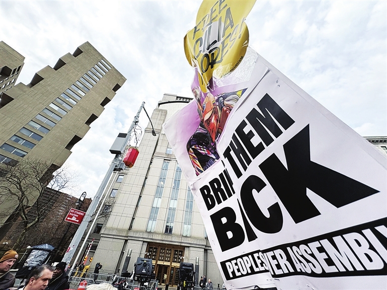 3月26日,在美国纽约,委内瑞拉总统马杜罗的支持者聚集在法院外抗议。