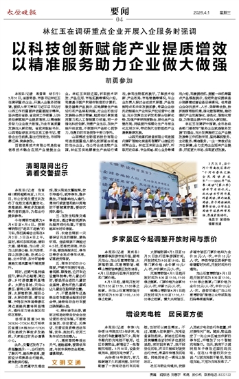 今年清明节假期为4月4日至4月6日。按照清明祭扫“赶早不赶晚”的习俗,祭扫高峰会出现在4月2日、3日及4日上午。届时,滨河东西两路、晋阳大道、晋祠路、龙山街、天龙山旅游公路、长风西街、西山旅游公路、卧虎山公路、北中环街、东中环路等道路交通流量将大幅度提升。