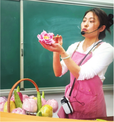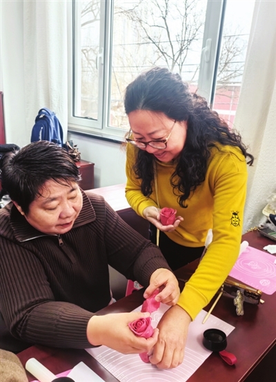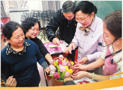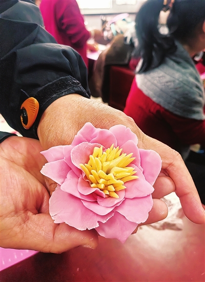 “上节课的寿桃制作大家都掌握了,今天咱们来做面花。”授课老师冯秀手提花篮,篮中色彩斑斓的面塑玫瑰栩栩如生,讲桌上还摆着一朵雍容华贵的面花牡丹。学员们眼前一亮,热切请求:“太逼真了,冯老师,快教我们做吧。”