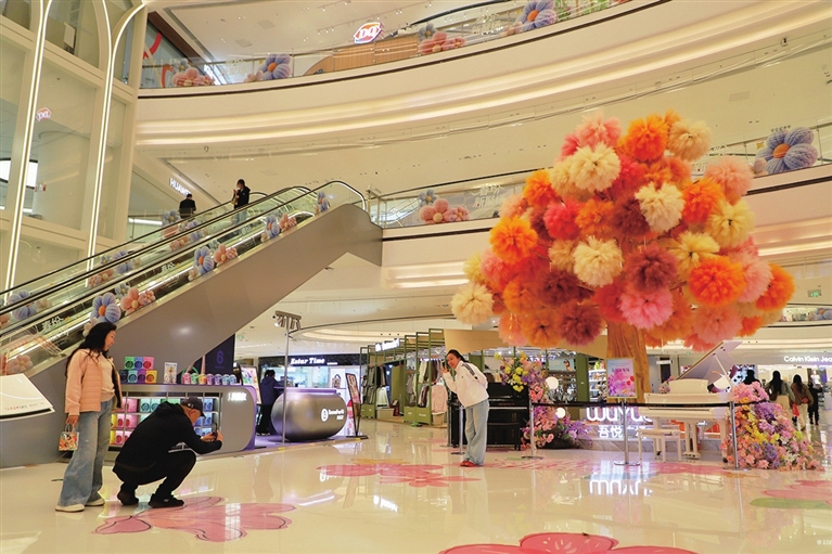 临近清明假期,省城各大商场纷纷推出以“春”为主题的活动,吸引消费者。图为4月1日,在吾悦广场大厅内,市民在毛绒多彩树前留影。 张昊宇 摄