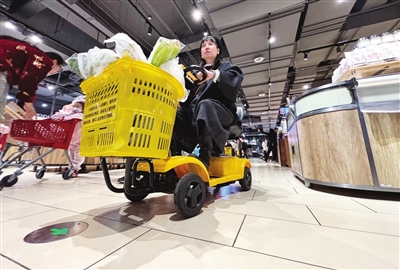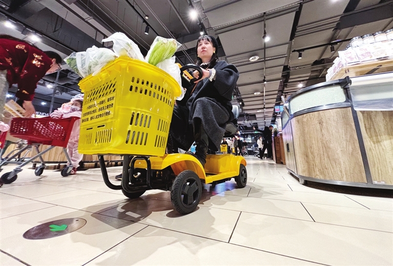 4月7日,省城府东街一家超市推出了电动购物车,消费者扫码付费后,就可以在超市内“开车”来回穿梭,轻松购物。 邓寅明 摄