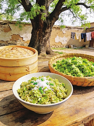 回到家,便开始做榆钱饭。奶奶细心拣去杂枝,用簸箕筛掉叶蒂,再用清水淘洗两三遍。沥干后撒上玉米面,拌少许油盐,反复揉匀,让每片榆钱都裹上一层薄粉,便可上锅蒸。蒸汽渐浓,厨房里渐渐清香四溢。约20分钟,掀开笼屉,白雾升腾,榆钱微微泛黄,甜香混着谷香扑面而来,让人垂涎。我迫不及待接过一碗,入口清甜绵软,带着淡淡的鲜咸,滋味朴素,却最是回味悠长。除了蒸榆钱饭,还可做榆钱窝窝、榆钱饼,蘸上香油醋蒜,或是蒸熟再炒,风味各有不同。