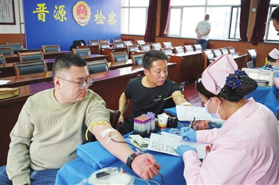 近日,晋源区检察院开展无偿献血活动,专业医护人员上门服务,将会议室临时布置成爱心献血屋。检察干警们踊跃参与,积极奉献爱心、传递温暖。 刘友旺 摄