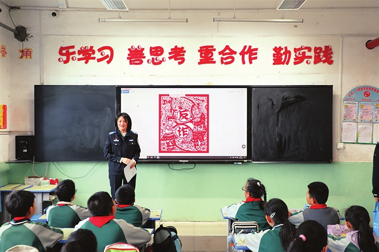 最吸引孩子们的,是多媒体大屏上展播的一组组法治主题剪纸作品。象征公平正义的法槌天平,警示网络陷阱的反诈盾牌,提醒信息安全的安全锁……一幅幅剪纸将抽象的法律条文变成了生动的画面,孩子们看得入神,在不知不觉中记住了安全知识。随后的趣味问答、情景模拟等互动环节,进一步强化学生对安全知识的记忆。