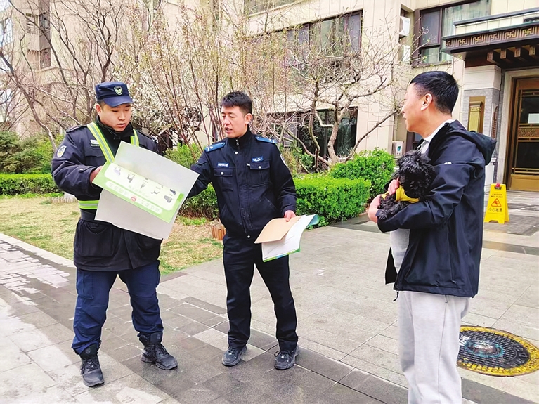 行动中,社区工作人员与民警采取“定点巡查+流动劝导”相结合的方式,重点对小区广场、绿化带、楼道出入口等人员密集区域进行检查。现场向养犬居民宣传文明养犬相关规定,讲解违规养犬的法律责任与安全风险,劝导养犬人做到遛犬牵绳、及时清理粪便、按规定办理养犬登记和疫苗接种,并对发现的不文明养犬行为当场予以提醒纠正。此次整治行动有效提升了居民依法养犬、文明养犬的意识。