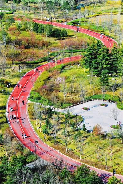 4月14日清晨,双塔公园春光秀丽,市民徜徉健身步道,尽享宜居城市之美。