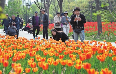 4月14日,迎泽公园郁金香盛放,前来赏花的游人络绎不绝。据悉,迎泽公园郁金香种植面积达10000余平方米,今年引进了羞涩阿波罗、塞纳达之爱、克劳斯王子、羞涩小姐等新品种。牛利敏 摄