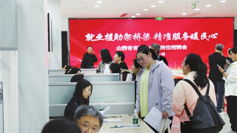 4月16日,由山西省就业服务局主办的山西省省直公益性岗位招聘会在省就业服务局一楼大厅举行。22家单位提供114个岗位。 郭苑甫 摄