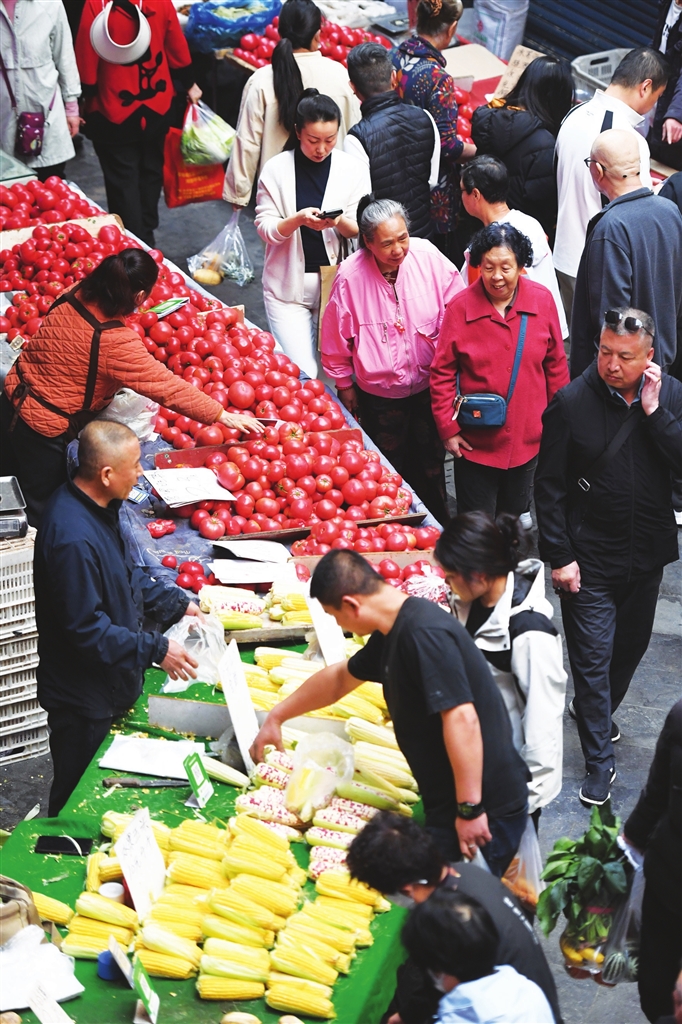 4月16日,省城开化寺早市,前来采购的市民络绎不绝。进入四月,本地蔬菜集中上市,市场供应充足、品类丰富,价格稳中有降。 邓寅明 摄