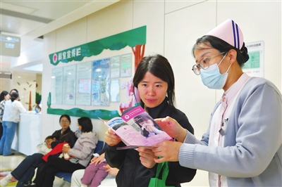 春季各类传染病高发,患儿增多。太原市妇幼保健院通过强化预检分诊、优化资源调配、加强健康宣教等举措应对就诊高峰。图为4月16日,护士向家长发放手足口病、流感等疾病防治手册。 王韵菲 摄