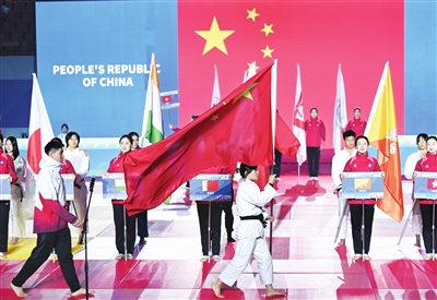 4月16日,2026年亚洲柔道锦标赛开幕式在内蒙古鄂尔多斯市举行。图为中国队在开幕式上入场。 新华社 发